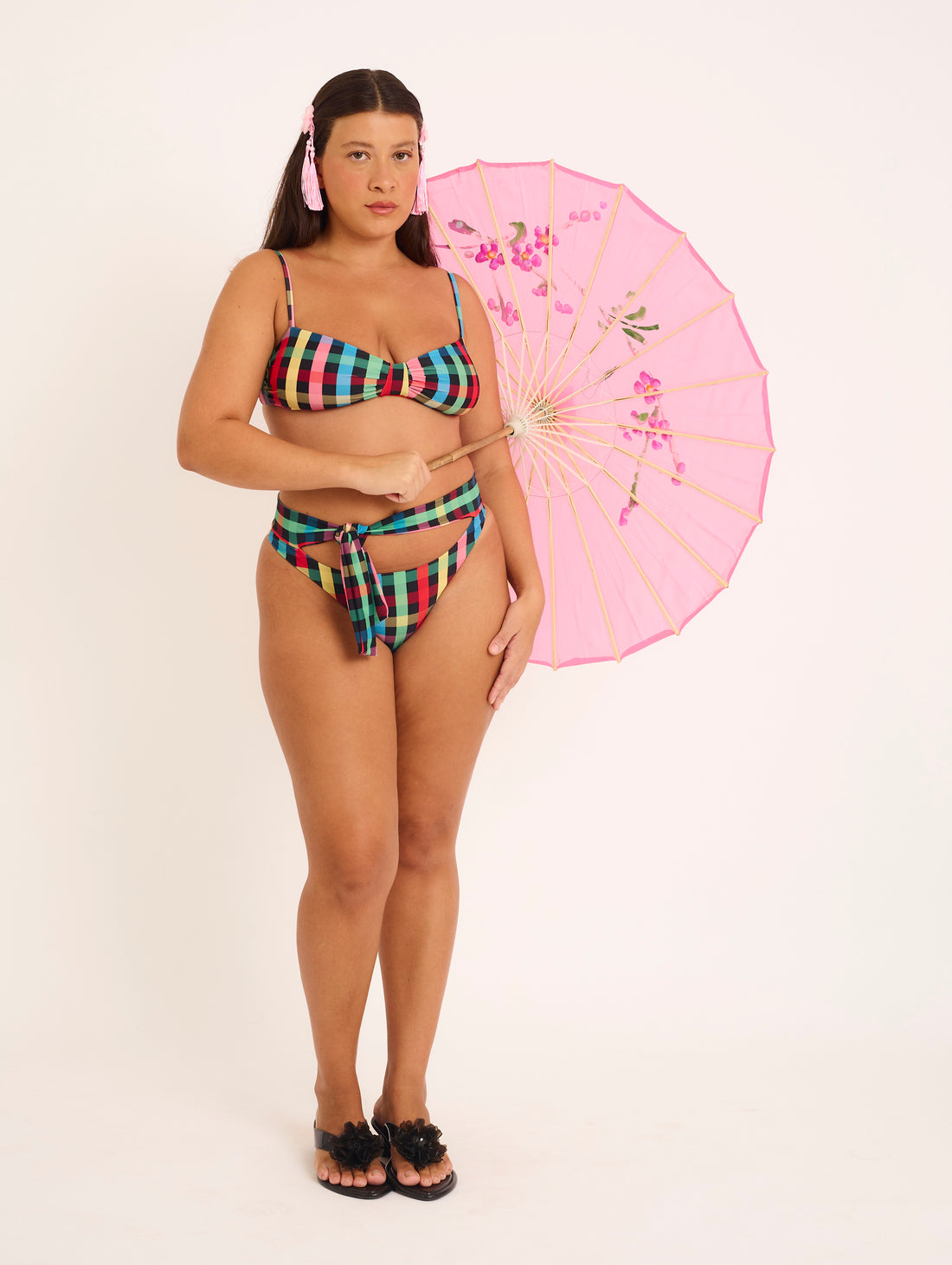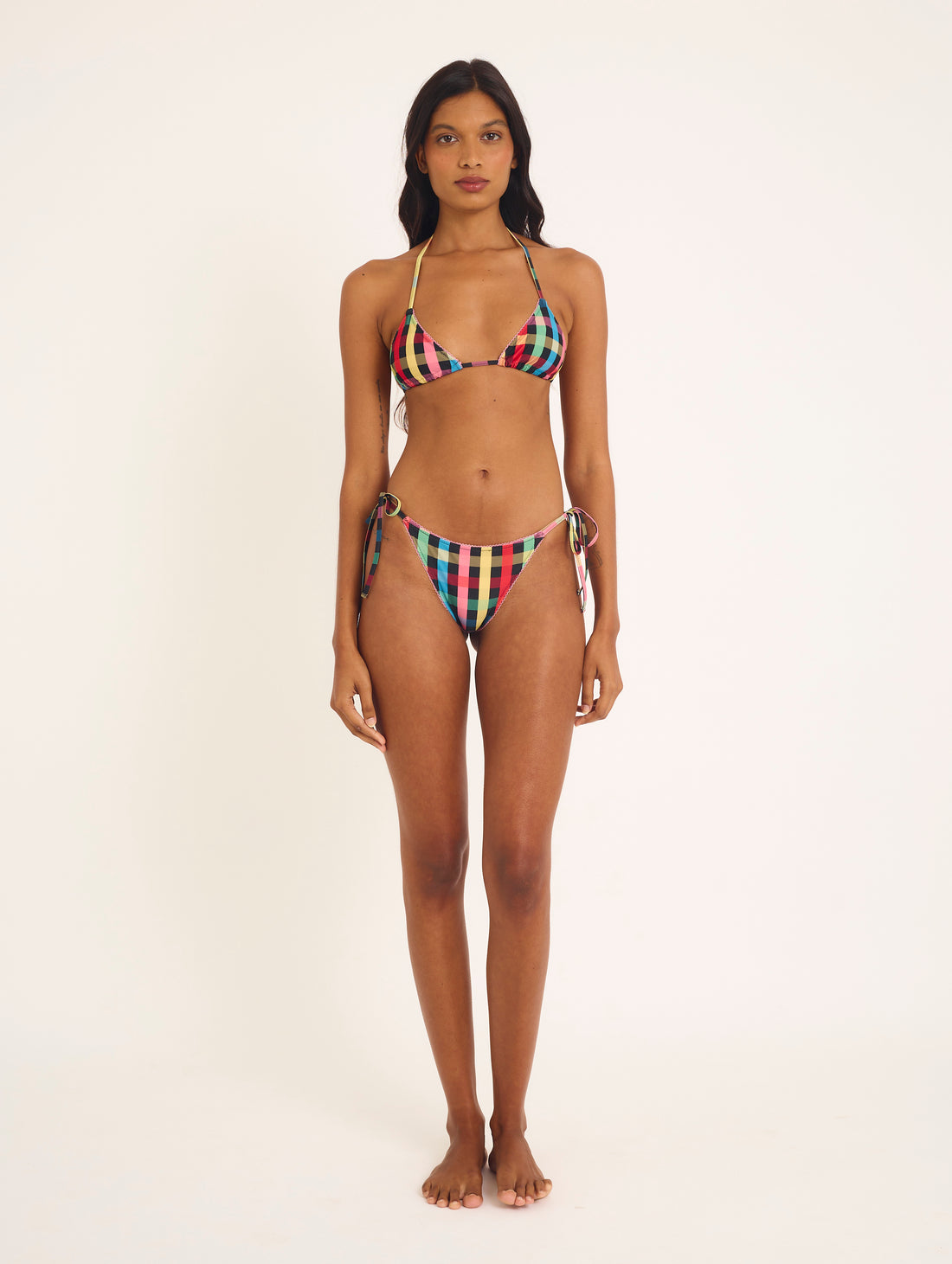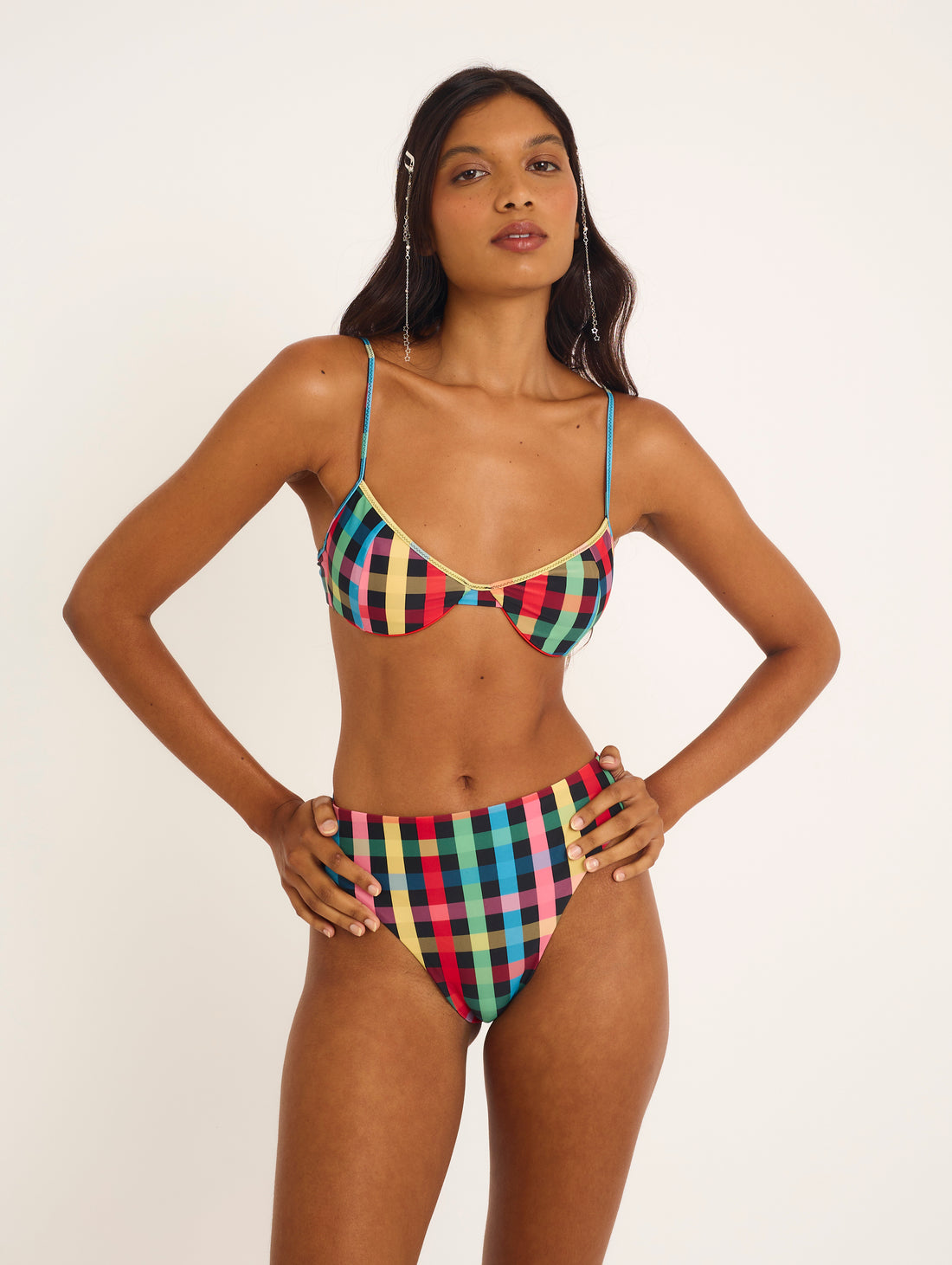 Biquini em lycra estampada com padrão geométrico em tons de Preto, Vermelho, Amarelo, Azul e...