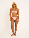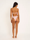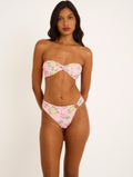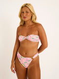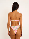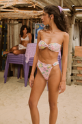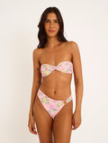 Printed lycra bikini with a floral pattern in shades of pink, yellow, green, and red. Print placement may vary.