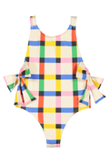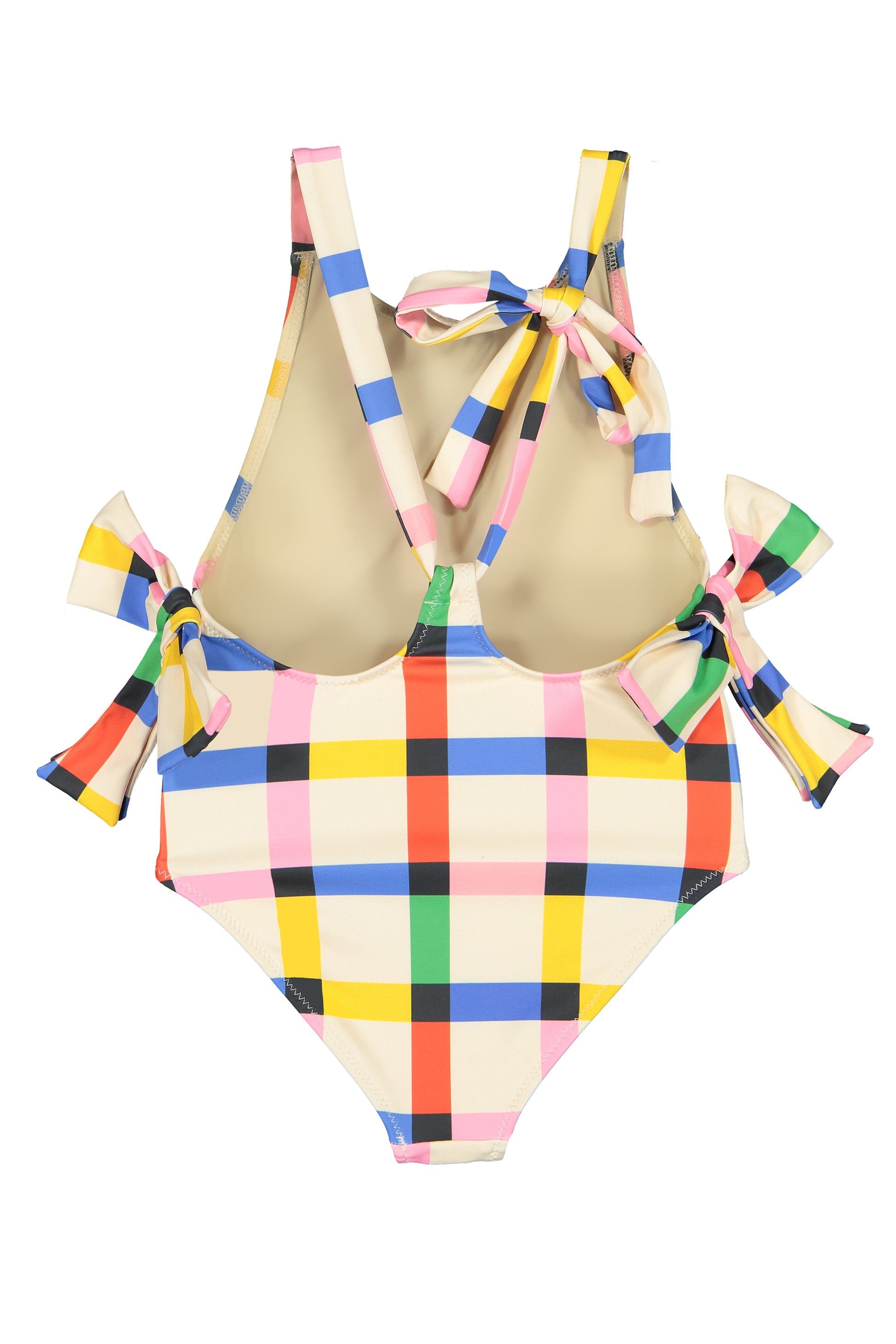 Bikini de lycra reciclada con estampado geométrico sobre fondo Off-White y tonos de Amarillo, Azul, Rojo y Verde.