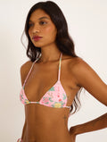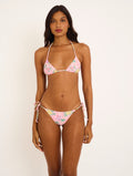 Biquini em lycra estampada com padrão floral em tons Cor de Rosa, Amarelo, Verde e Vermelho. A posição da estampa pode variar.