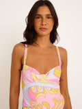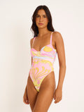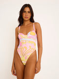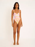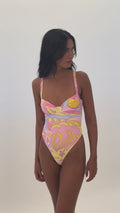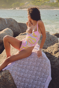 Fato de Banho em lycra estampada com padrão abstrato em tons de Lilás, Amarelo e Cor de Rosa. A posição da estampa pode variar.
