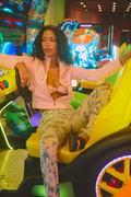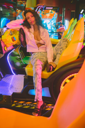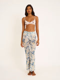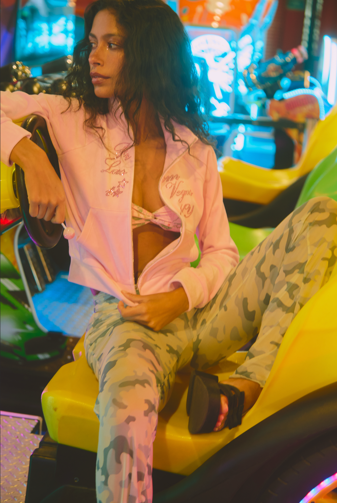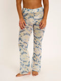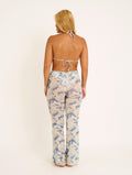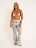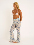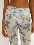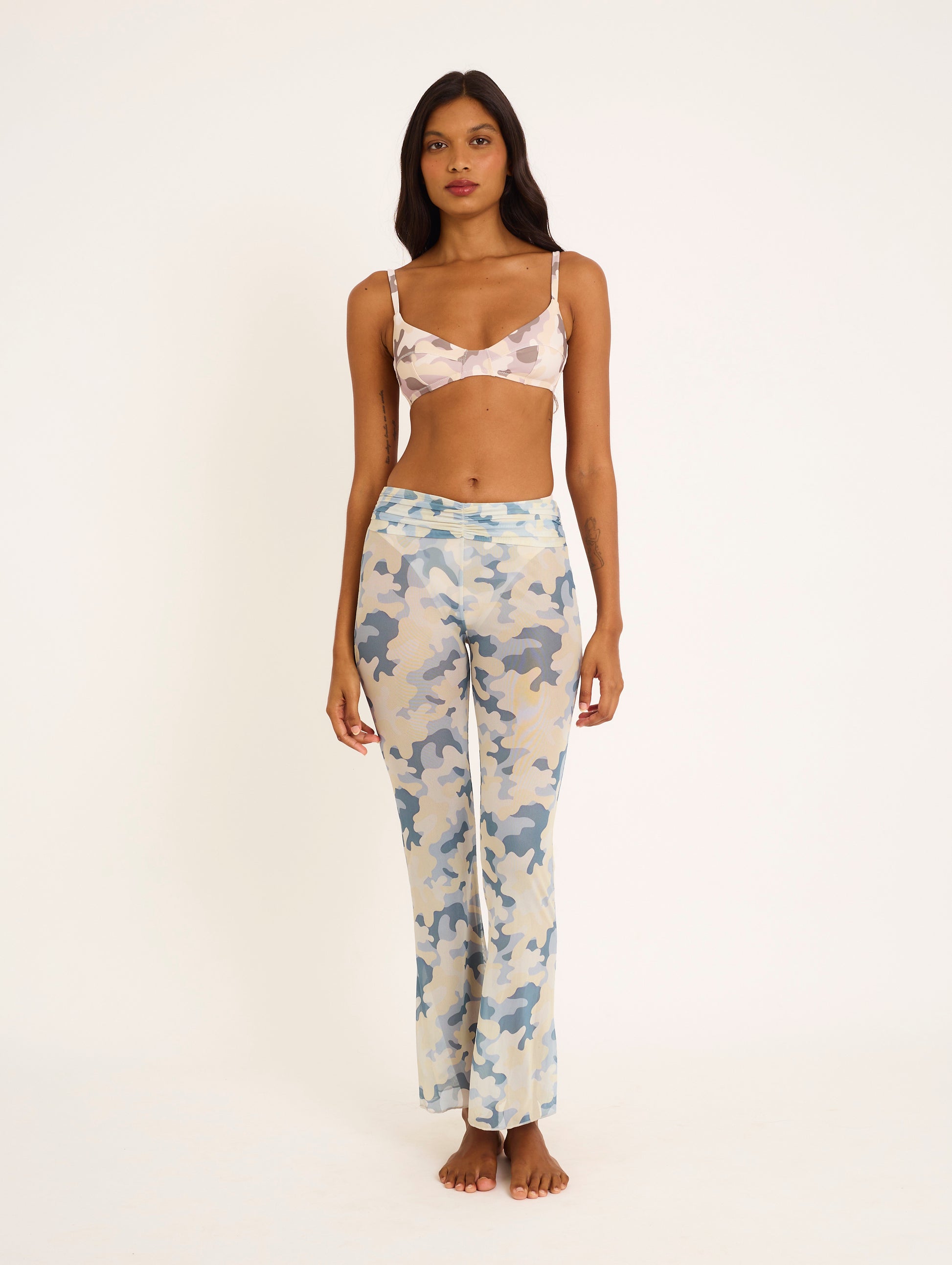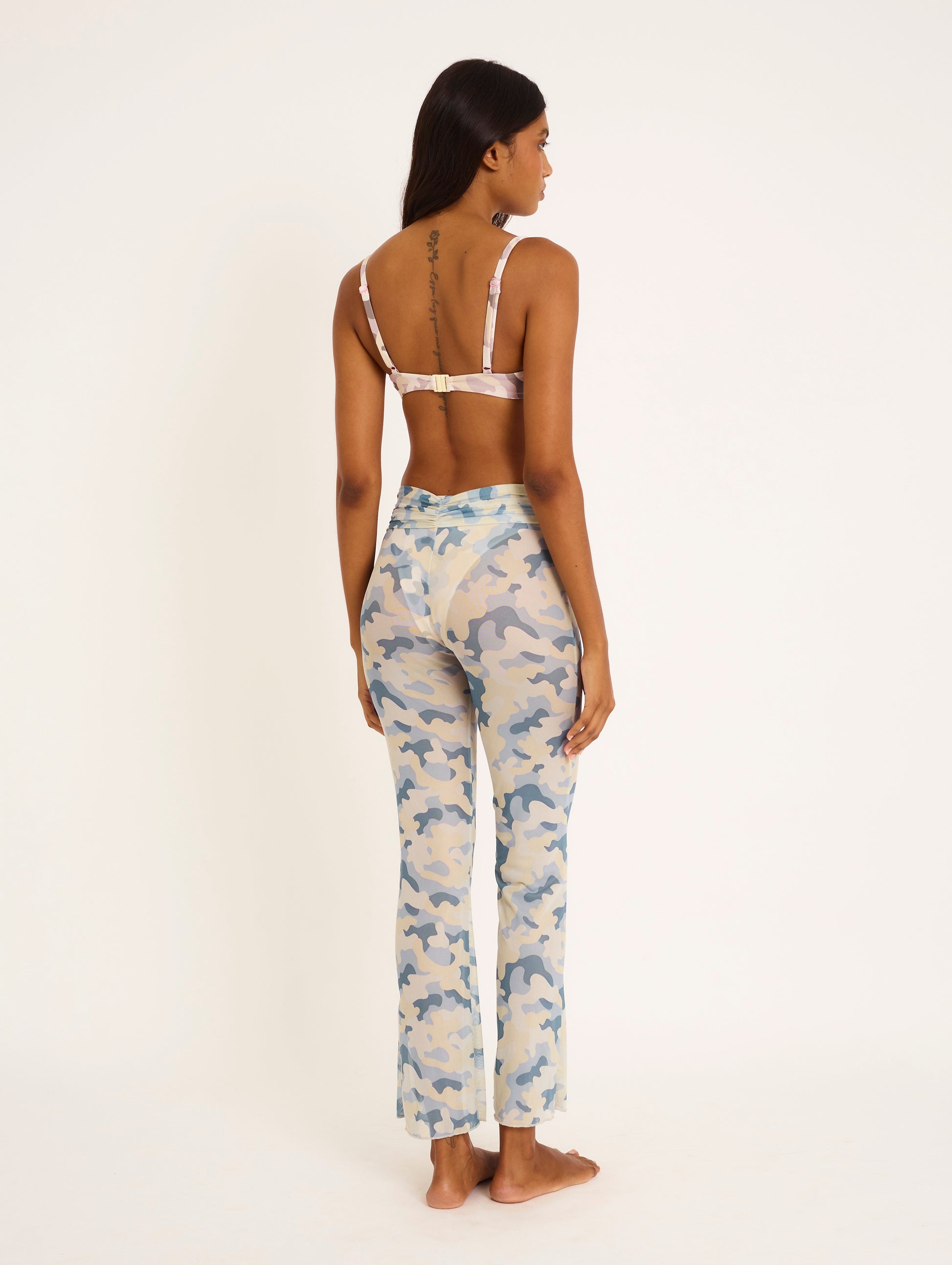 Calças em Tule fluídas à boca de sino clom franzido no meio. Estampa com padrão de camuflagem em tons neutros.