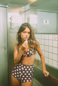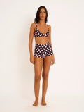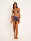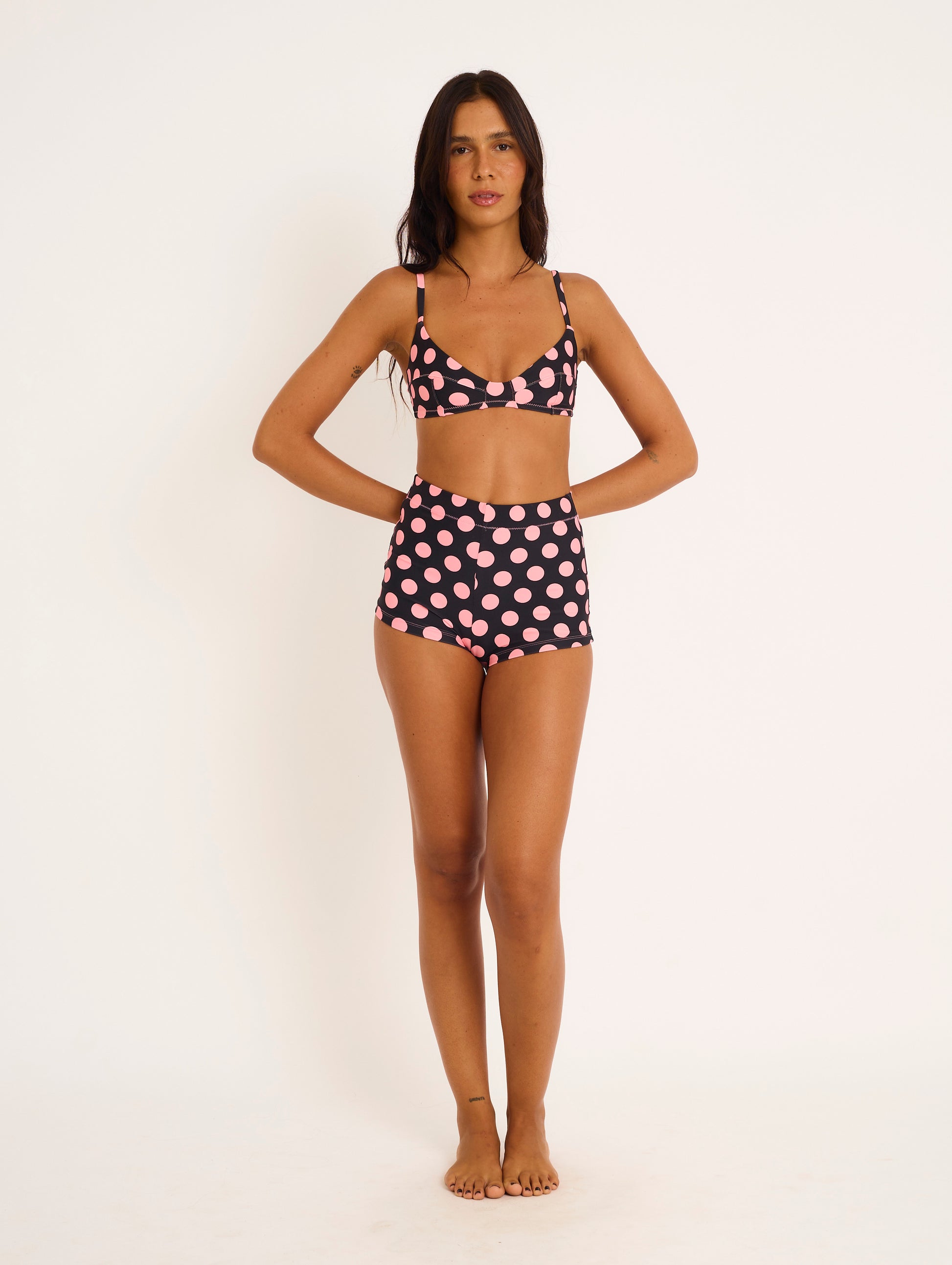 Calções justos em lycra. Estampa com padrão às bolinhas em tons de Cor de Rosa e Preto.