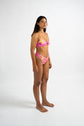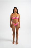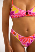Biquini em lycra reciclada com estampa floral em tons de cor de rosa, cor de laranja e roxo. A posição da estampa pode variar.