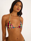 Biquini em lycra estampada com padrão geométrico em tons de Preto, Vermelho, Amarelo, Azul e Verde. Renda no rebordo do biquini. A posição da estampa pode variar.