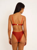 Biquini em lycra brilhante castanha com vivo vermelho à volta.
