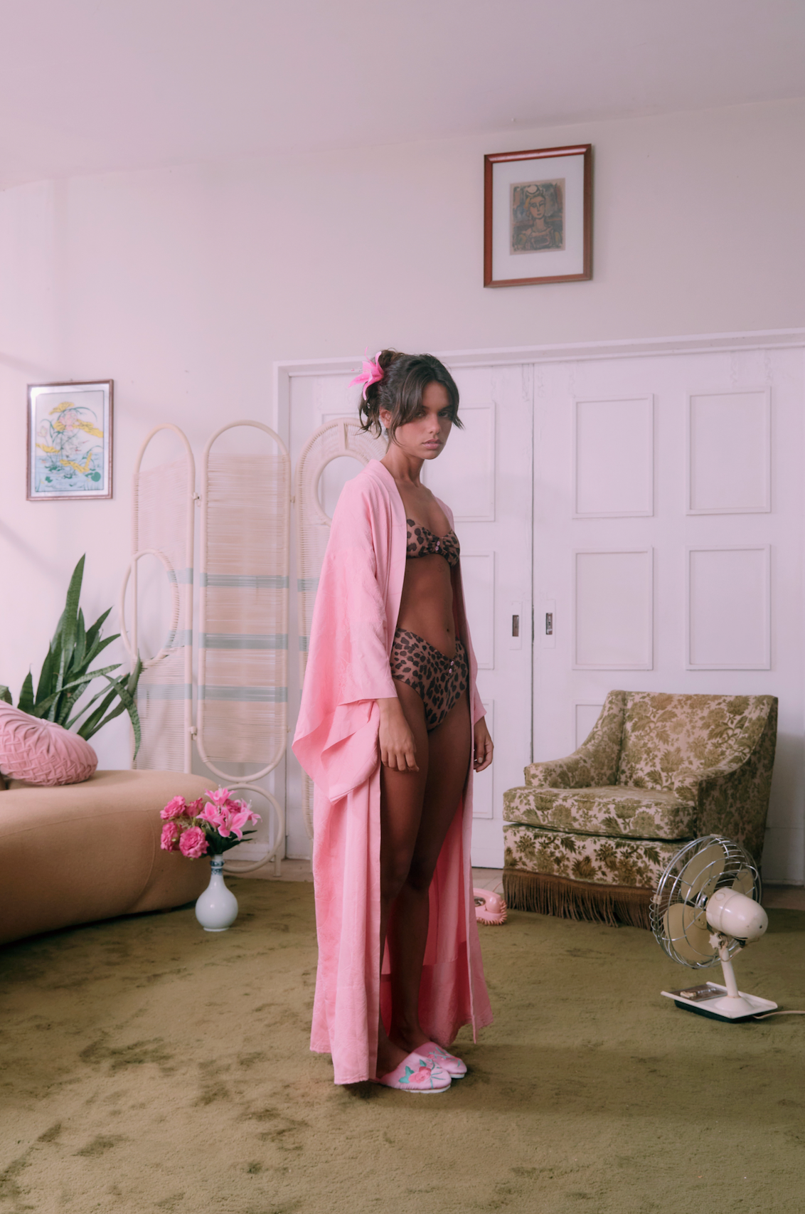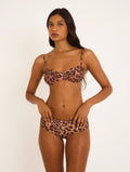 Biquini em lycra estampada com padrão leopardo em tons de Castanho. A posição da estampa pode variar.