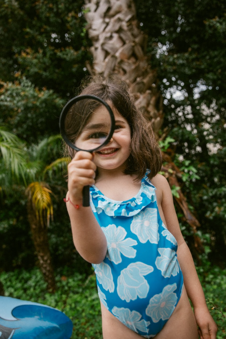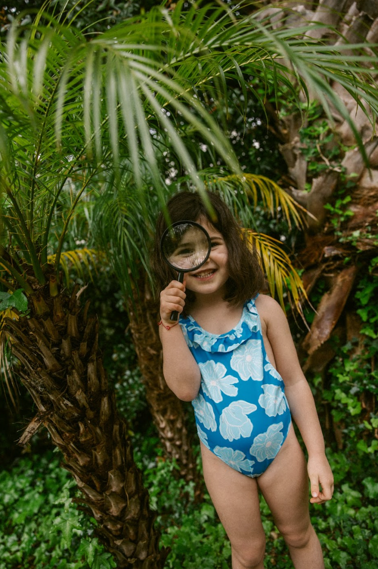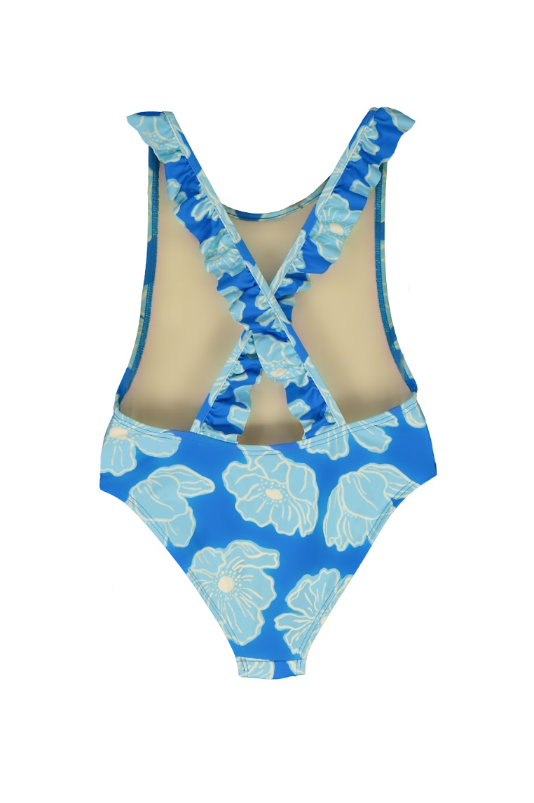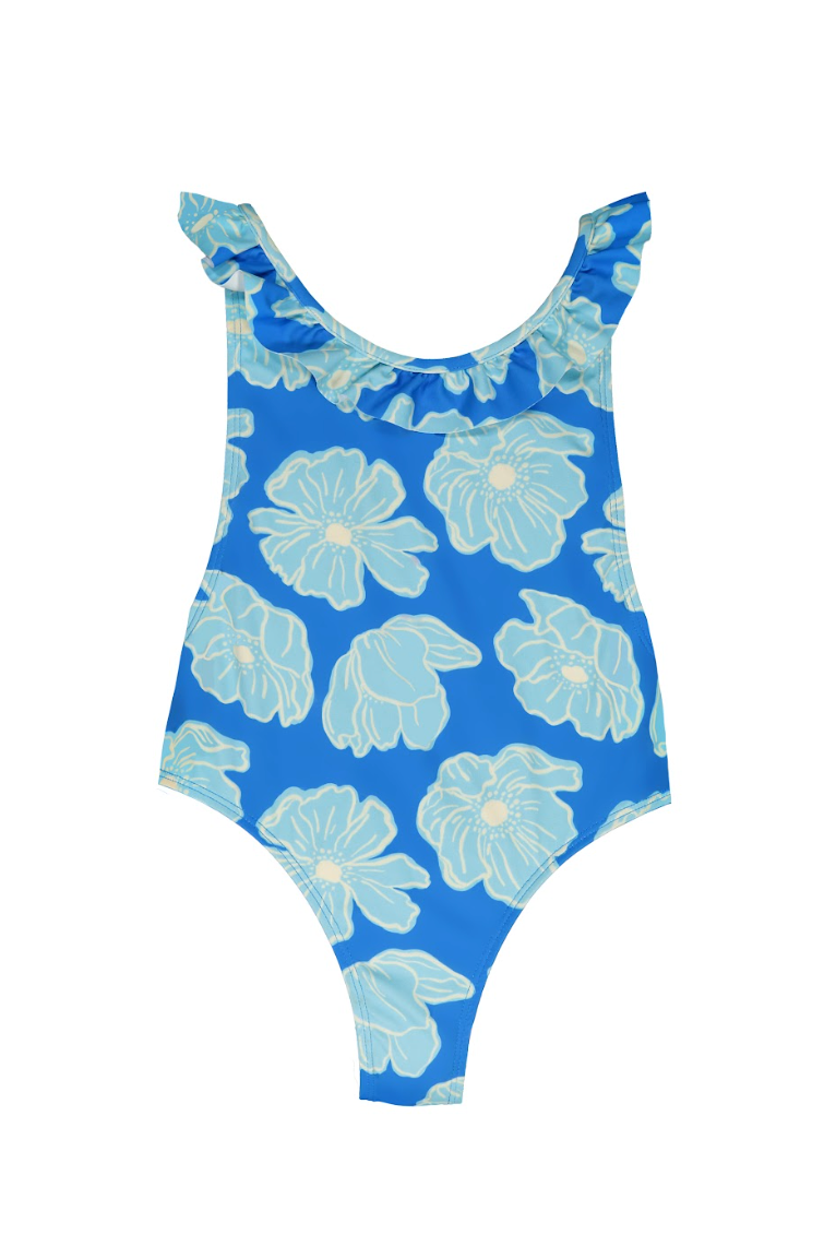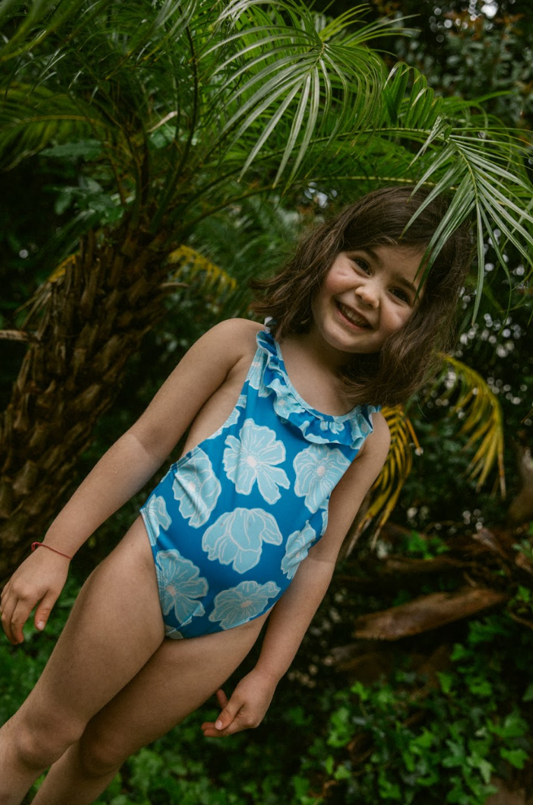 Fato de Banho em lycra reciclada com estampa floral em tons de Azul e Off White. A posição da estampa pode variar.
